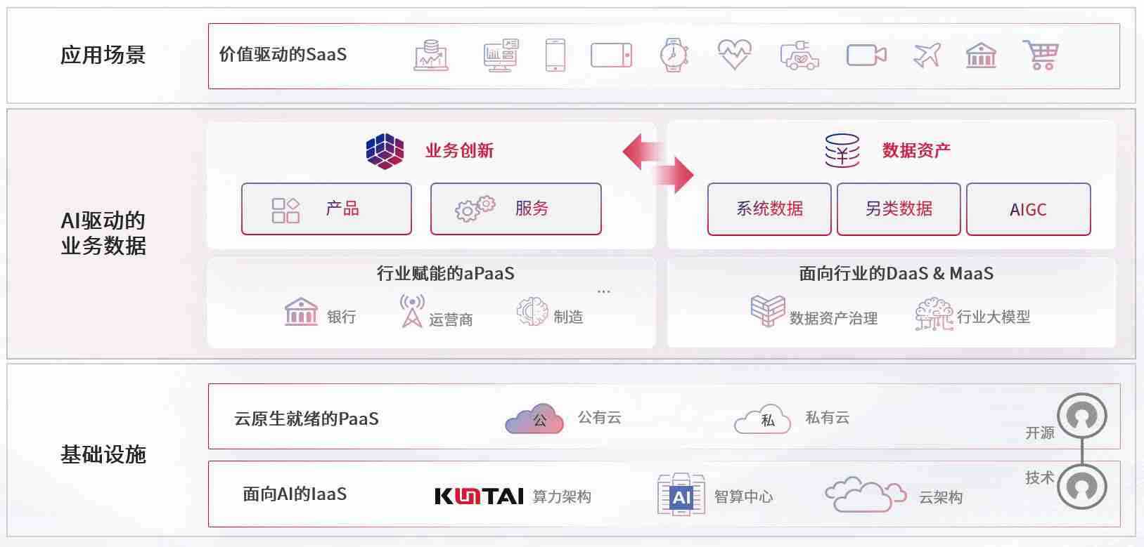 数字时代,,,围绕企业数字化转型的关键要素,,,TOP1体育数码开创性的提出数云融合战略和技术体系框架,,,,着力在云原生、、数字原生、、、AI原生和信创产业上架构产品和服务能力,,,为处在不同数字化转型阶段的快消零售、、、、汽车、、金融、、、、医疗、、、、政企、、、教育、、、运营商等行业客户提供泛在的敏捷IT能力和融合的数据驱动能力,,,构建跨界融合创新的数字业务场景和新业务模式,,,,助力企业级客户建立面向未来的核心能力和竞争优势,,,全面推动社会的数字化、、智能化转型升级。。